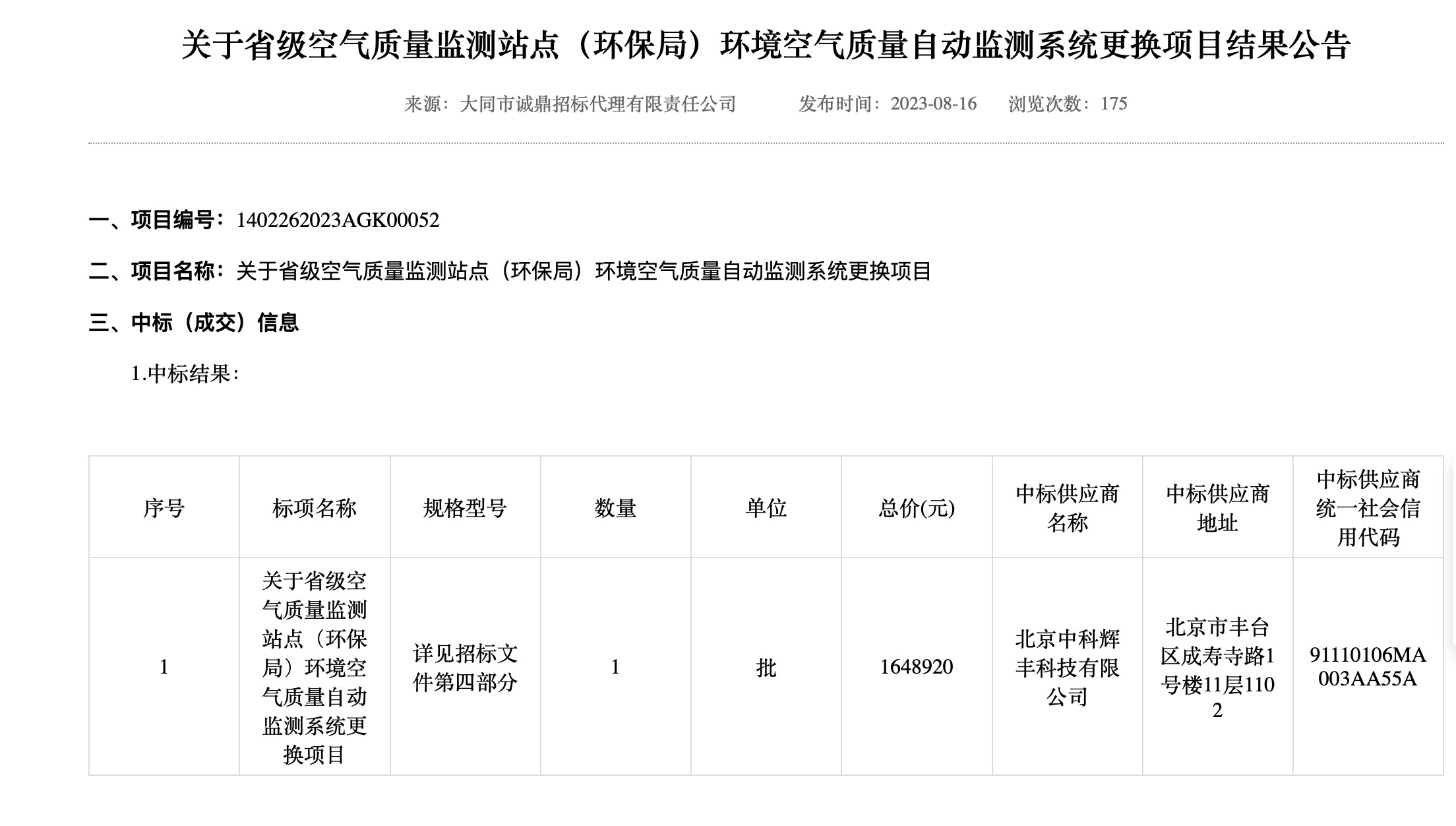 【摘要】: 關于省級空氣質量監測站點(環保局)環境空氣質量自動監測系統更換項目結果公告
