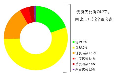 1月,京津冀及周邊地區“2+26”城市平均優良天數比例為49.4%,同比上升26.0個百分點;PM2.5濃度為72微克/立方米,同比下降41.0%。北京市1月優良天數比例為77.4%,同比下降3.2個百分點;PM2.5濃度為38微克/立方米,同比下降37.7%。